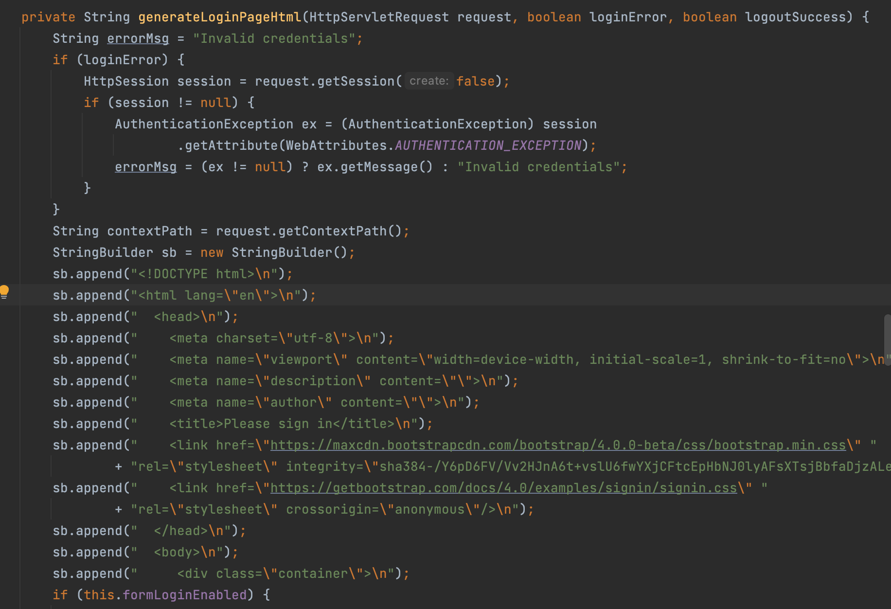 DefaultLoginPageGeneratingFilter 소스를 열어보면 다른 설정을 하지 않았을 때 기본적으로 보았던 로그인 창의 html를