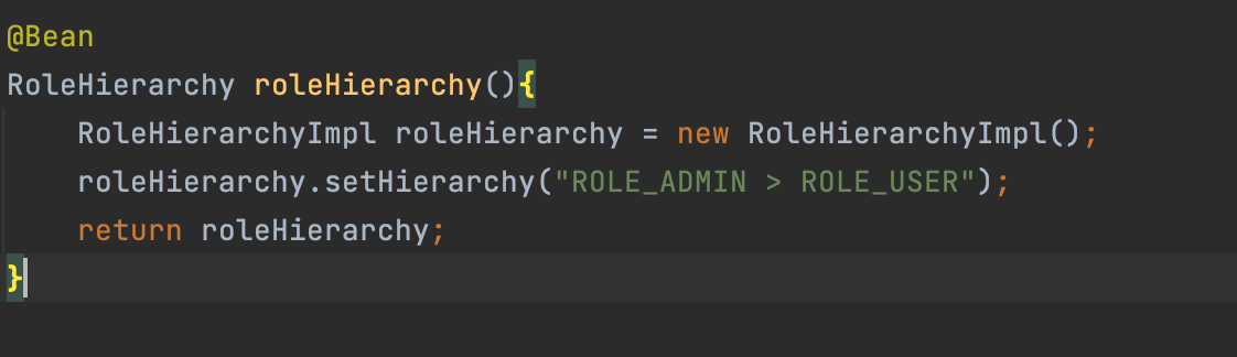 RoleHierachy는 인터페이스고 RoleHierachyImpl 은 구현체이다 . RoleHierachyImpl을 생성해서 Hierarchy를 등록해 주고 리턴한다. 해당 메서드를 빈으로 등록해 두면 스프링이 인식하여 다른 설정없이 동작한다 .