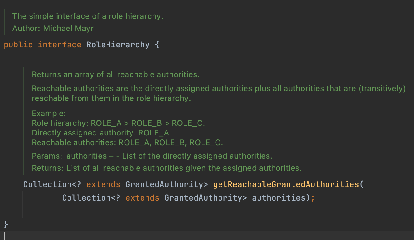예를 들어 ROLE_A > ROLE_B > ROLE_C 로 설정해두면 ROLE_A는 B,C의 모든 권한을 갖을 수 있다 .