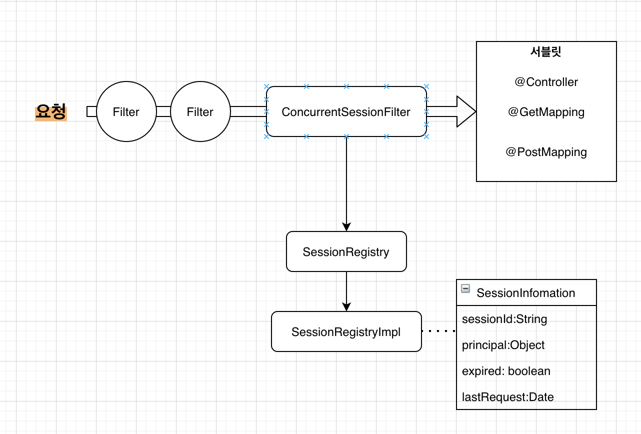 session은 톰캣과 같은 서블릿 컨테이너에서 제공하는 것이기 떄문에 스프링이 세션을 제어할 수는 없고 톰캣이 넘겨주는 세션을 스프링은 sessionInformation이라는 랩퍼객체를 만들어 SessionRegistry에서 관리한다. 톰캣의 세션과 SessionRegistry의 세션이 일치한다고는 할 수 없지만 요청이 들어왔을때 스프링에서 sessionInformation의 expired를 통해 해당 세션을 스프링 컨테이너로 받아 줄지 말지를 결정할 수 있기 때문에 세션을 관리하는 효과를 낼 수 있다 해당 역할을 하는 필터가 ConcurrentSessionFilter이다.