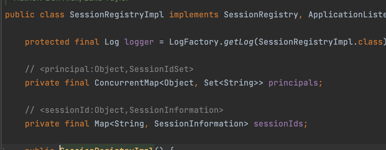 principals 과 sessionIds 를 필드로 갖고 있으며 구현체로는 SessionRegistryImpl 클래스가 있다.
