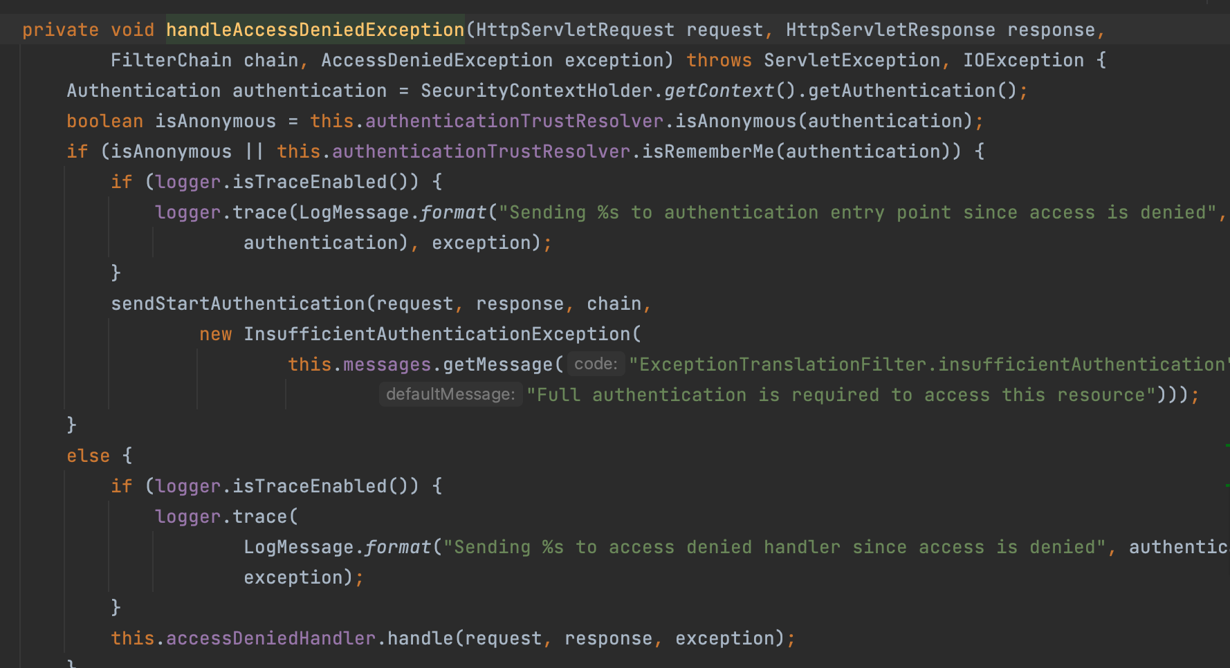 체크하고 AccessDeniedException라면 AuthenticationTrustResolver를 통해 익명사용자인지 리멤버미 사용자인지를 확인한다 .