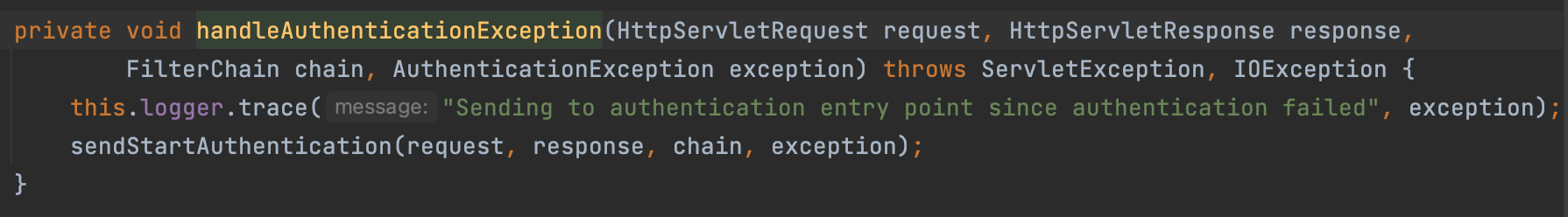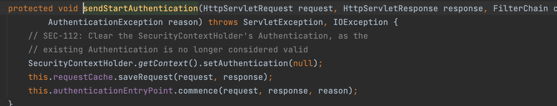sendStartAuthentication을 호출하고 sendStartAuthentication에서는 authenticationEntryPoint.commence를 호출하여 인증 시작페이지로 보내버린다.