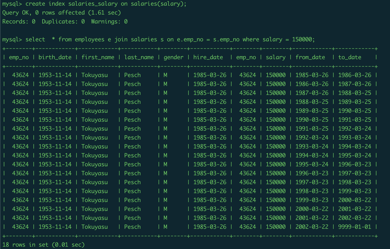 - 2번에서 인덱스가 추가될때 1.55초가 걸리는 걸 알 수 있다. 만약 salary 컬럼에 수정이 일어나게 될 경우 인덱스도 같이 수정되기 때문에 업데이트 시간이 늘어날 수 있다 .