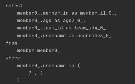 위의 메서드를 통해 나온 쿼리 이다 List에 담겨있던 username이 in절에 바인딩 되었다.