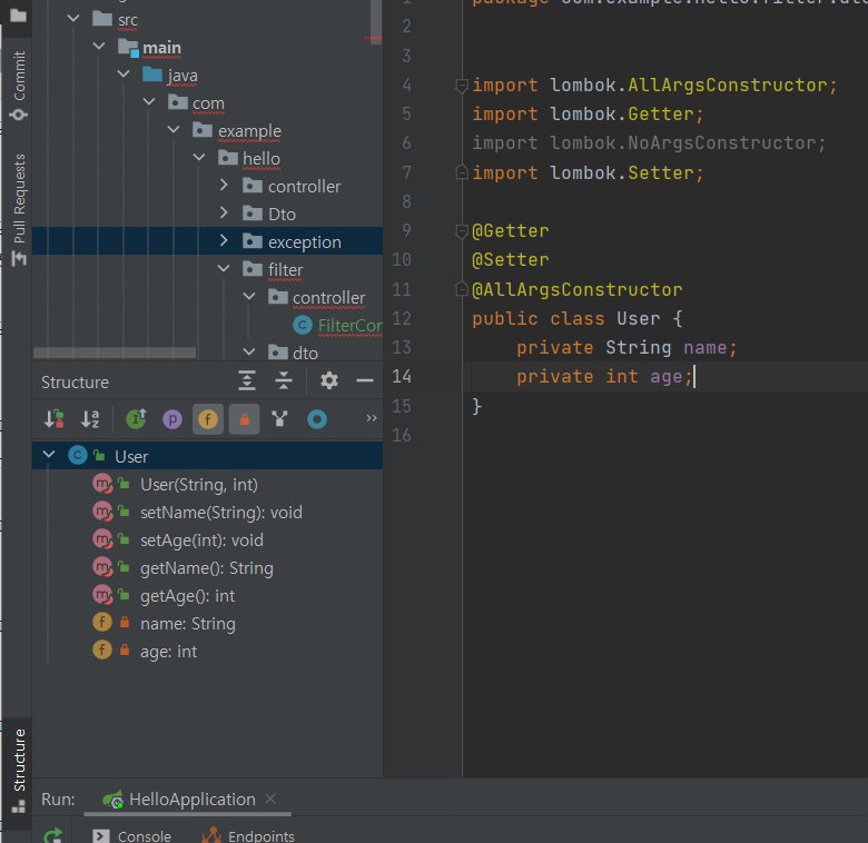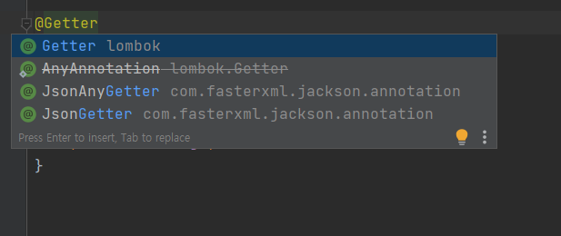 디펜던시가 잘 들어왔다면 위처럼 lombok의 어노테이션을 사용할 수 있다.