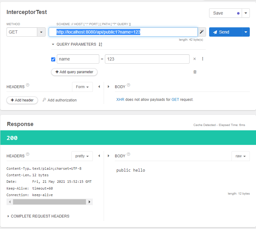 /api/public 경로는 인터셉터를 거치지 않았고 검증 없이 요청 응답이 성공했다.